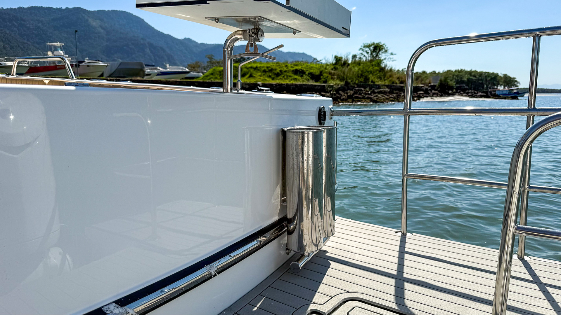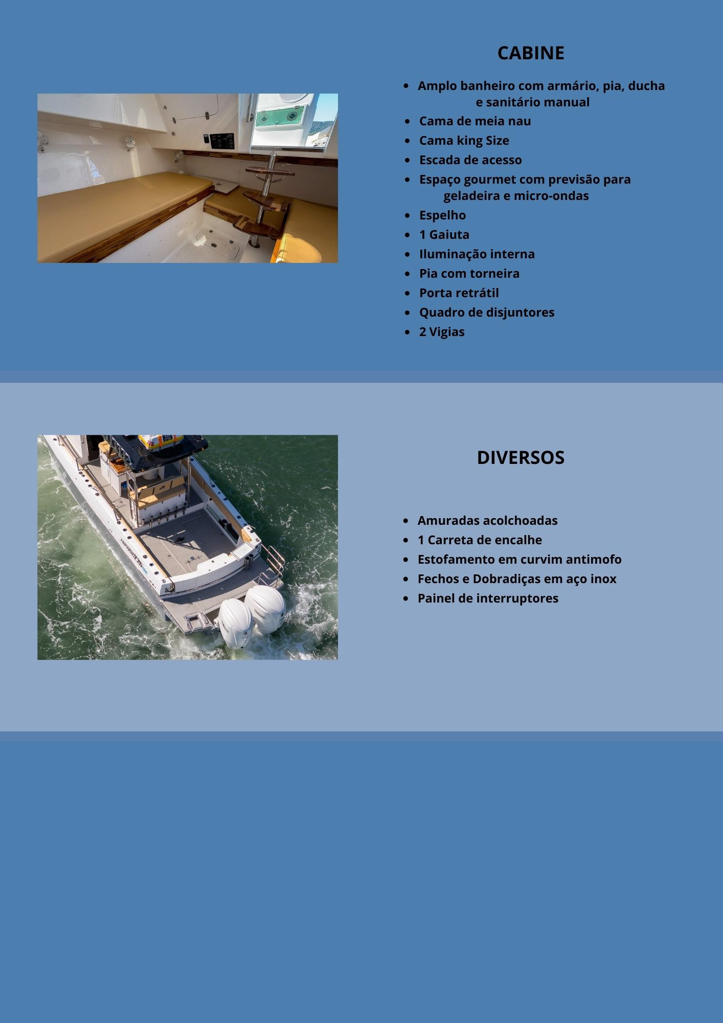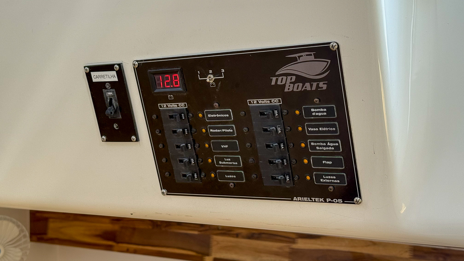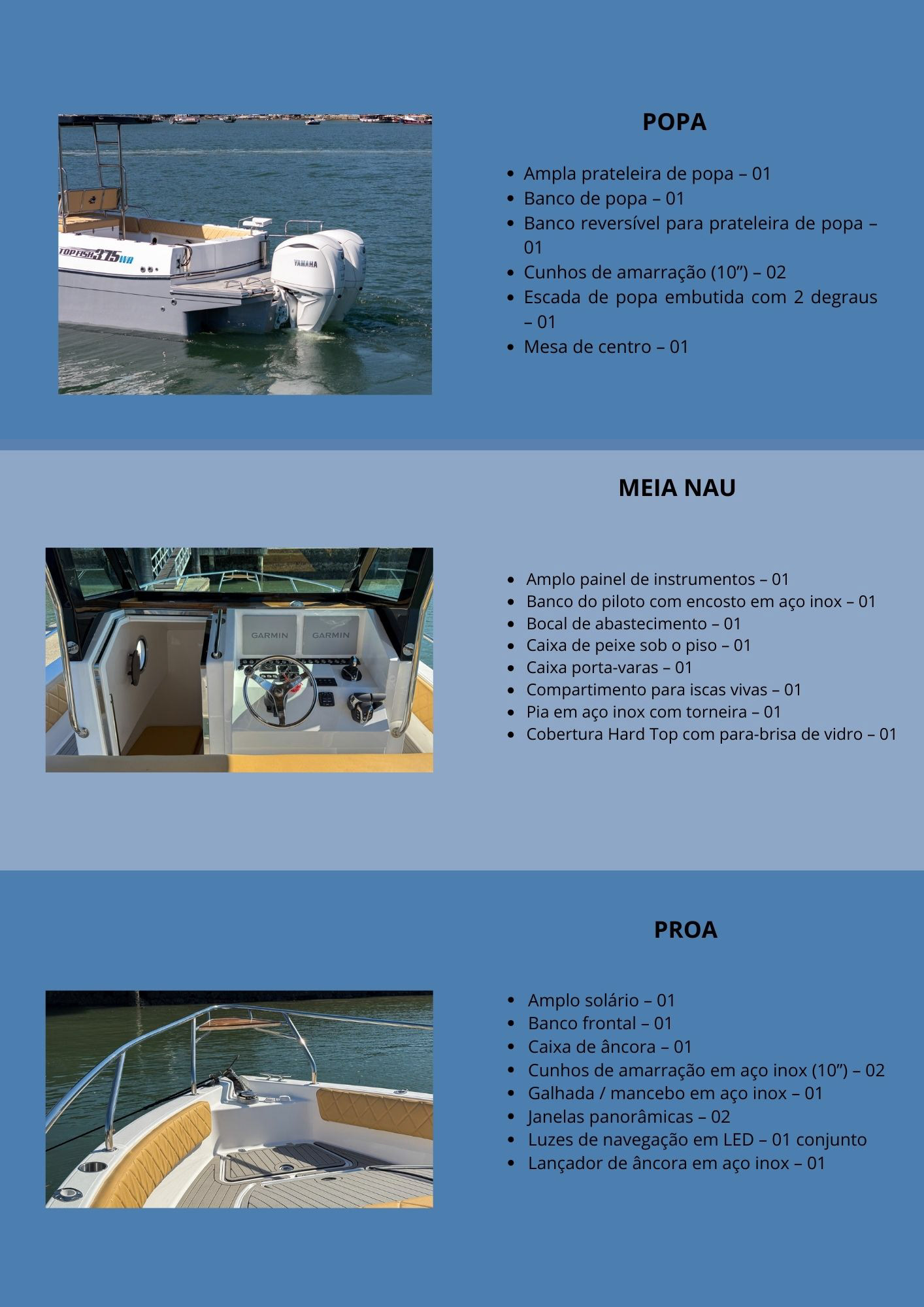 Com capacidade para até 12 pessoas, a Top Fish 375 Custom possui 11,30 metros de comprimento, 3,10 metros de boca máxima e conta com tanque de combustível de 1.100 litros, oferecendo excelente autonomia para travessias prolongadas. O tanque de água doce de 200 litros reforça o conforto a bordo durante longos períodos de uso.