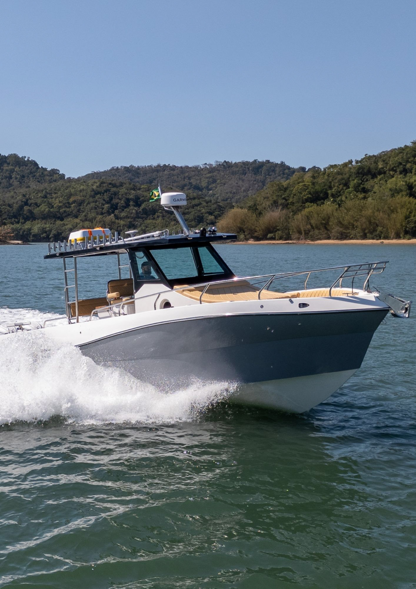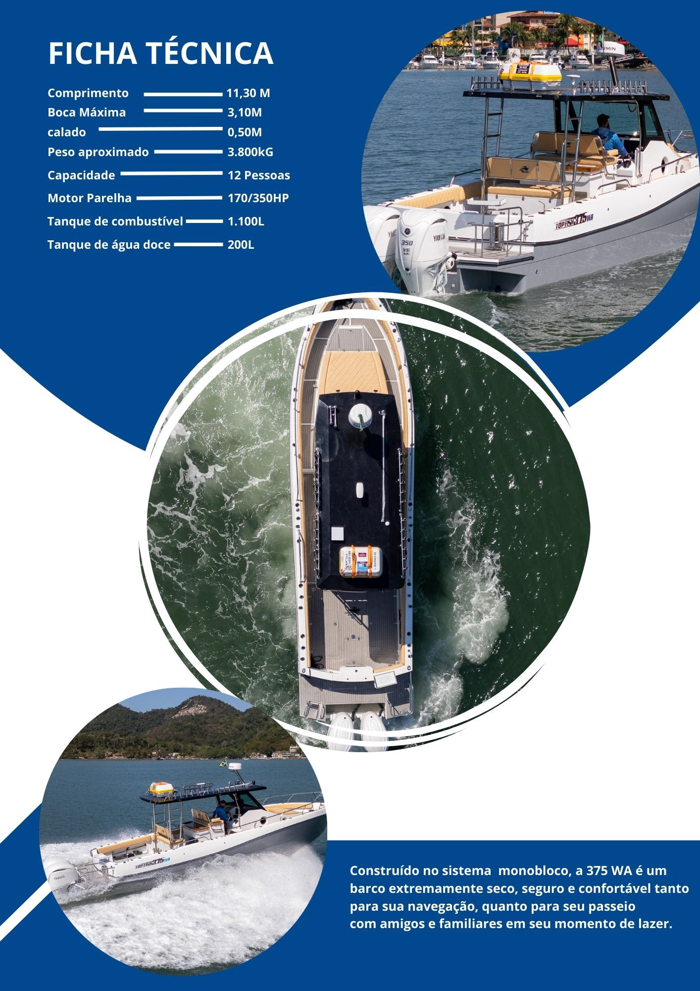Projetada para navegação em mar aberto e costeira, a Top Fish 375 WA foi desenvolvida para atender de forma híbrida todas as necessidades de uma pescaria esportiva de longa distância, além de garantir conforto, segurança acima do padrão e amplo espaço para passeios em família.